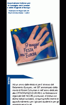 Ad un anno dalle elezioni per il rinnovo del Parlamento Europeo, nel 50° anniversario della morte di Robert Schuman e nell’anno dedicato alla CITTADINANZA EUROPEA, la Federazione regionale dell’A.I.C.C.R.E. del Friuli V.G. promuove, d’intesa con diversi Istituti scolastici, cinque specifici eventi di approfondimento per i giovani studenti e per gli amministratori locali.