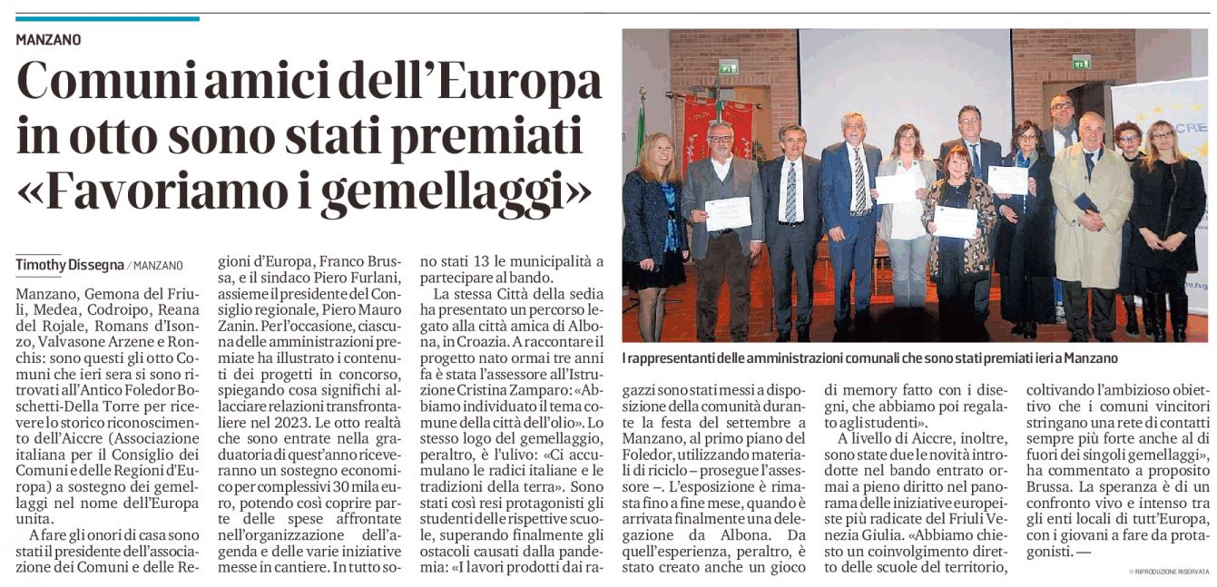 Nella cornice della Sala Antico Foledor Boschetti – Della Torre sita in Via Natisone, 36, in Comune di Manzano (UD), si è tenuta venerdì 24 febbraio 2023 a partire dalle ore 17:00, la Cerimonia di Premiazione dei Comuni vincitori del Premio AICCRE per iniziative di Gemellaggio 2022.