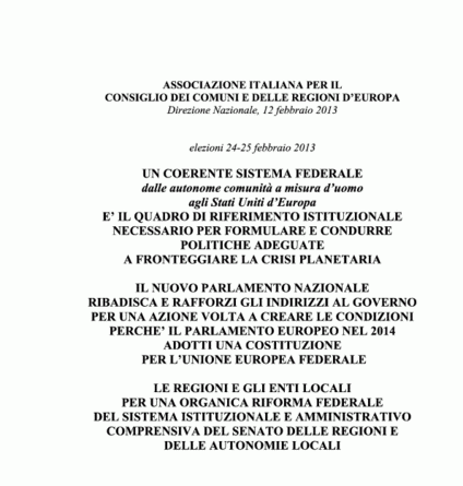 Documento approvato il 12 febbraio dalla Direzione Nazionale dell’AICCRE, rivolto ai candidati al parlamento (Elezioni del 24 e 25 Febbraio 2013).