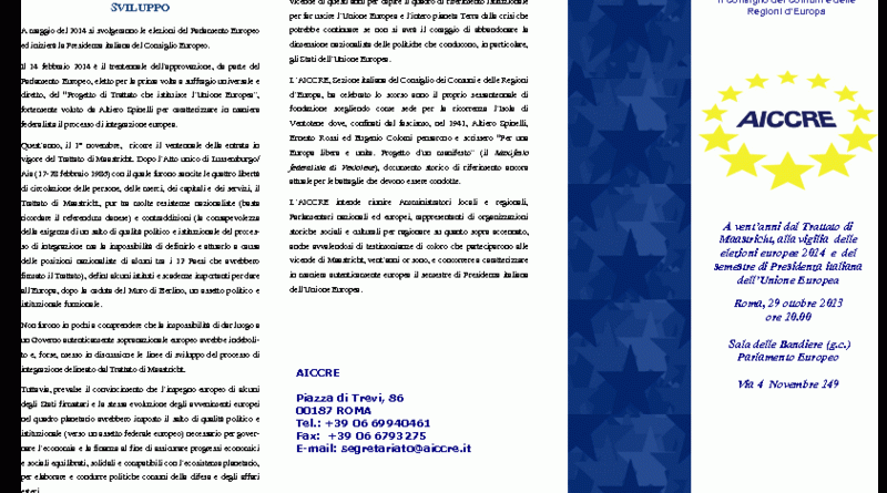 L’AICCRE intende riunire Amministratori locali e regionali, Parlamentari nazionali ed europei, rappresentanti di organizzazioni storiche sociali e culturali per ragionare su quanto sopra accennato, anche avvalendosi di testimonianze di coloro che parteciparono alle vicende di Maastricht, vent’anni or sono, e concorrere a caratterizzare in maniera autenticamente europea il semestre di Presidenza italiana dell’Unione Europea.
