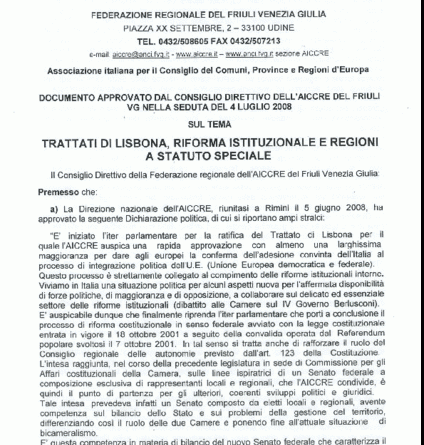 Un documento sui Trattati di Lisbona, Riforma istituzionale e Regioni a Statuto Speciale è stato inviato nei giorni scorsi dall”A.I.C.C.R.E. del F.V.G. a tutti i soci titolari e individuali,  ai membri degli organismi dirigenti, al Sen. Roberto Di Giovan Paolo – Segretario Generale nazionale, all’On. Michele Scandroglio – Segretario Generale aggiunto, ai Parlamentari del Friuli Venezia Giulia,  al Sen. Giacomo Santini – Vice Presid. XIV Comm.ne UE Senato nonchè ai Presidenti di ANCI, Federsanità ANCI FVG, UPI e UNCEM.