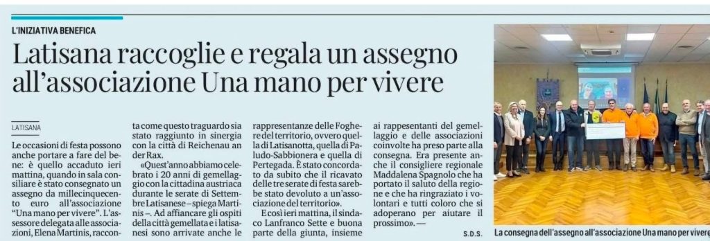 le città gemellate consegnano il risultato di una raccolta fondi a favore dell’Associazione “Una mano per vivere”