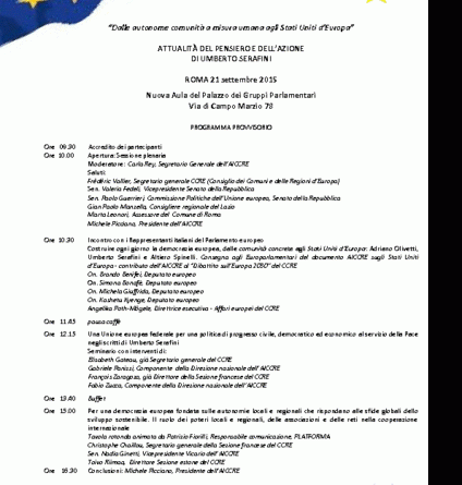 Tema della giornata che prevede diversi interventi sarà: “Dalle autonome comunità a misura umana agli Stati Uniti d’Europa”. Attualità del pensiero e dell’azione di Umberto Serafini. L’AICCRE ha fortemente voluto questa iniziativa per ricordare Umberto Serafini (1916-2005), il cui solido pensiero federalista che ha accompagnato le sue battaglie politiche di mezzo secolo è stato colpevolmente dimenticato dal mondo della cultura e delle politica. Serafini costituì nel 1950 il Consiglio dei Comuni (poi anche delle Regioni) d’Europa e la sezione italiana (AICCRE) alla quale dedicò le sue energie per tutta la vita. Umberto è stato un alfiere fondamentale ispiratore e realizzatore del contributo sempre più rilevante portato dagli enti locali e regionali alla costruzione di un’Europa unita e federale e contribuì, insieme ad Altiero Spinelli ed Alexandre Marc, a guidare quel “fronte democratico europeo” che si batté duramente e con successo nella lotta per l’elezione popolare diretta del Parlamento europeo.